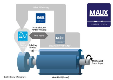O enrolamento auxiliar MAUX Mecc Alte é um enrolamento separado dentro dos estatores principais que alimenta o regulador. Este enrolamento permite que cada um dos nossos alternadores receba uma sobrecarga de 300% de corrente forçada (manutenção de curto-circuito) por 20 segundos. Isso é ideal para requisitos de partida do motor.