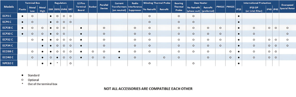 A nova série C-TYPE apresenta várias opções, incluindo a nova caixa de terminais de baixo perfil. Esta caixa de terminais foi projetada para aplicações que exigem pequenas dimensões. Seu design foi estudado levando em consideração todos os acessórios disponíveis da Mecc Alte e o regulador.